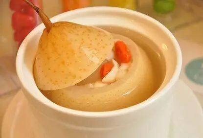做法:将雪梨切开两半,中间挖空,将象牙丝放中间。隔水炖。喝水,也可连肉吃。